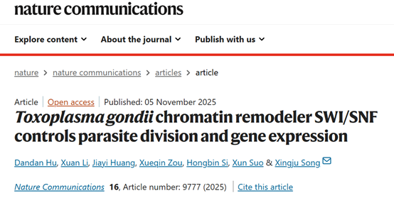 2025年11月5日,我室“动物寄生虫病防控”团队的胡丹丹副教授与宋星桔副教授在人兽共患弓形虫表观遗传学研究领域取得了重要研究进展,研究成果以Toxoplasma gondii chromatin remodeler SWI/SNF controls parasite division and gene expression为题发表于国际知名期刊《Nature Communications》。原文链接:https://www.nature.com/articles/s41467-025-64751-x。
