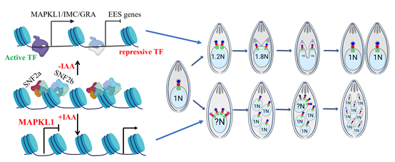 弓形虫(Toxoplasma gondii)生命周期极为复杂,涉及多种不同的发育阶段和分裂方式。该研究首次揭示了两个SWI/SNF 染色质重塑复合体对弓形虫染色质结构和基因转录的协同调节作用,并揭示了它们是维持弓形虫速殖子分裂方式所必需的核心激活因子。鉴于 SWI/SNF 对寄生虫存活与分裂不可或缺,且其结构与功能特征与宿主(人类和多种哺乳动物)存在差异,该复合体有望成为极具吸引力的新型药物靶点,为抗弓形虫病药物研发提供全新的策略与路径。广西大学为该论文的第一完成单位,胡丹丹副教授与硕士毕业生李轩为共同第一作者,宋星桔副教授为通讯作者。