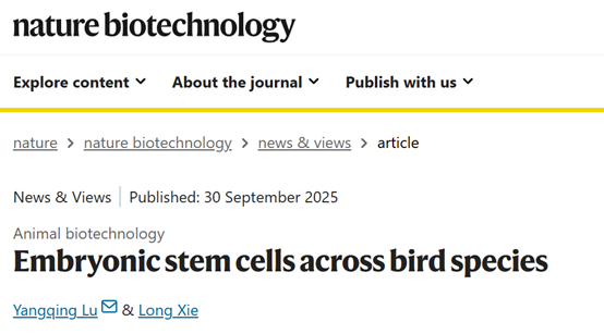 近日,我室动物繁殖调控方向陆阳清教授与中国农业科学院深圳农业基因组研究所谢龙副研究员合作,在国际知名期刊Nature Biotechnology在线发表题为 “Embryonic stem cells across bird species” 的观点评述文章。